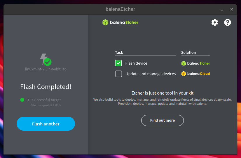 Une fois terminé, Etcher nous affiche un rapport si l'écriture sur la clé USB s'est bien déroulée. Nous pouvons maintenant retirer la Clé USB de son port.