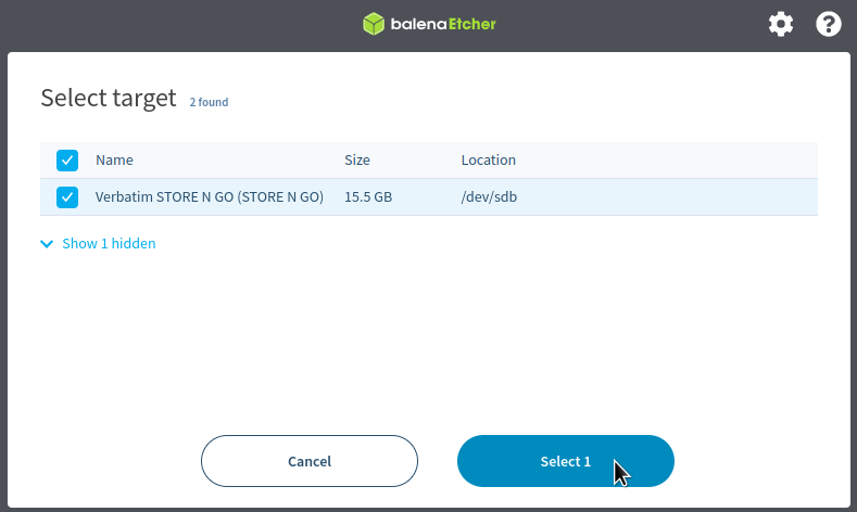 En cliquant sur le bouton, nous pouvons sélectionner notre clé USB dans la liste, en cochant sa case, puis cliquer sur Select 1 (car nous en avons sélectionné une seule.)