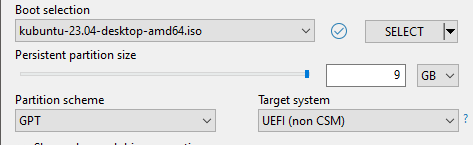 - Partition Scheme / Target System : tout va dépendre de l'âge de votre ordinateur. Généralement, depuis 2008, les ordinateurs utilisent le système de démarrage de UEFI, tandis qu'auparavant ils utilisaient le système MBR. Ainsi, on choisira une option GPT + UEFI (non CSM) pour une clé USB devan démarrer sur un système récent. et une option MBR /BIOS pour un ordinateur ancien.