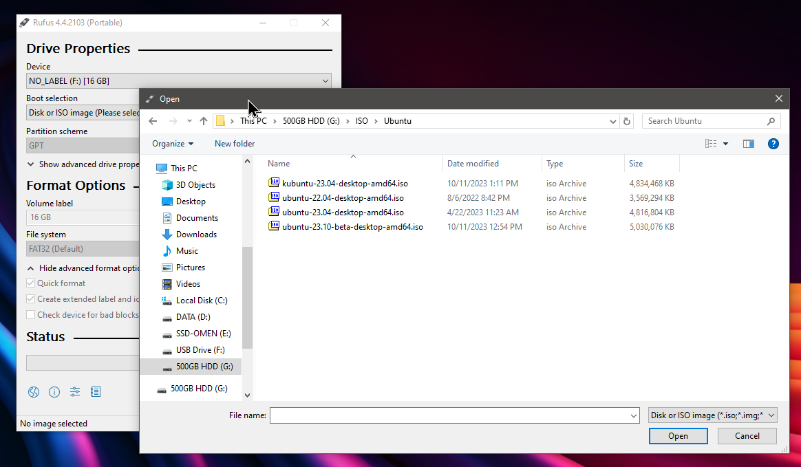 - Ensuite, on peut cliquer sur le bouton SELECT, et utiliser la fenêtre qui s'ouvre pour sélectionner notre fichier .iso, puis valider en cliquant sur le bouton Open