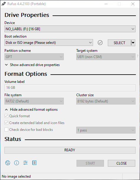 Après avoir téléchargé Rufus et lancé le programme on se retrouve avec la fenêtre suivante :